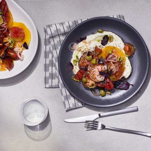 A whipped feta and watermelon combination is a staple and an all-round favourite starter when it comes to summer dining. While you don’t strictly need to griddle (or barbecue) the watermelon for this dish, the addition of the heat really helps to concentrate the sweetness of the flesh, pairing perfectly with the saltiness of the feta. Look for a nice variation of shapes and sizes for the tomatoes to add extra visual appeal to your plate.